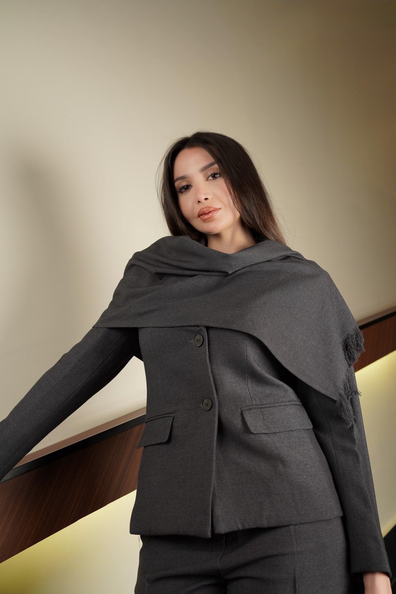 التصمیم: مخطط،، ، جیوب، ، بطانة، تفاصیل شا ل علي الكتف